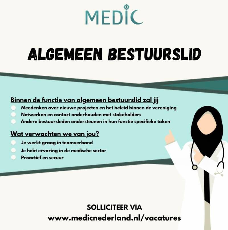 Vereniging Medic bestaat inmiddels ruim drie jaar. Ons hoofddoel als vereniging is om bij te dragen aan de zorg voor patiënten en de ontwikkeling van zorgprofessionals in Nederland, geïnspireerd door islamitische principes. De afgelopen jaren hebben we ons voornamelijk gefocust op de bekendmaking van de vereniging, het opstarten van projecten en het uitbreiden van ons team. Nu ons team en achterban groter is geworden alhamdulilah, willen we een algemeen bestuurslid aannemen die ons team kan versterken.